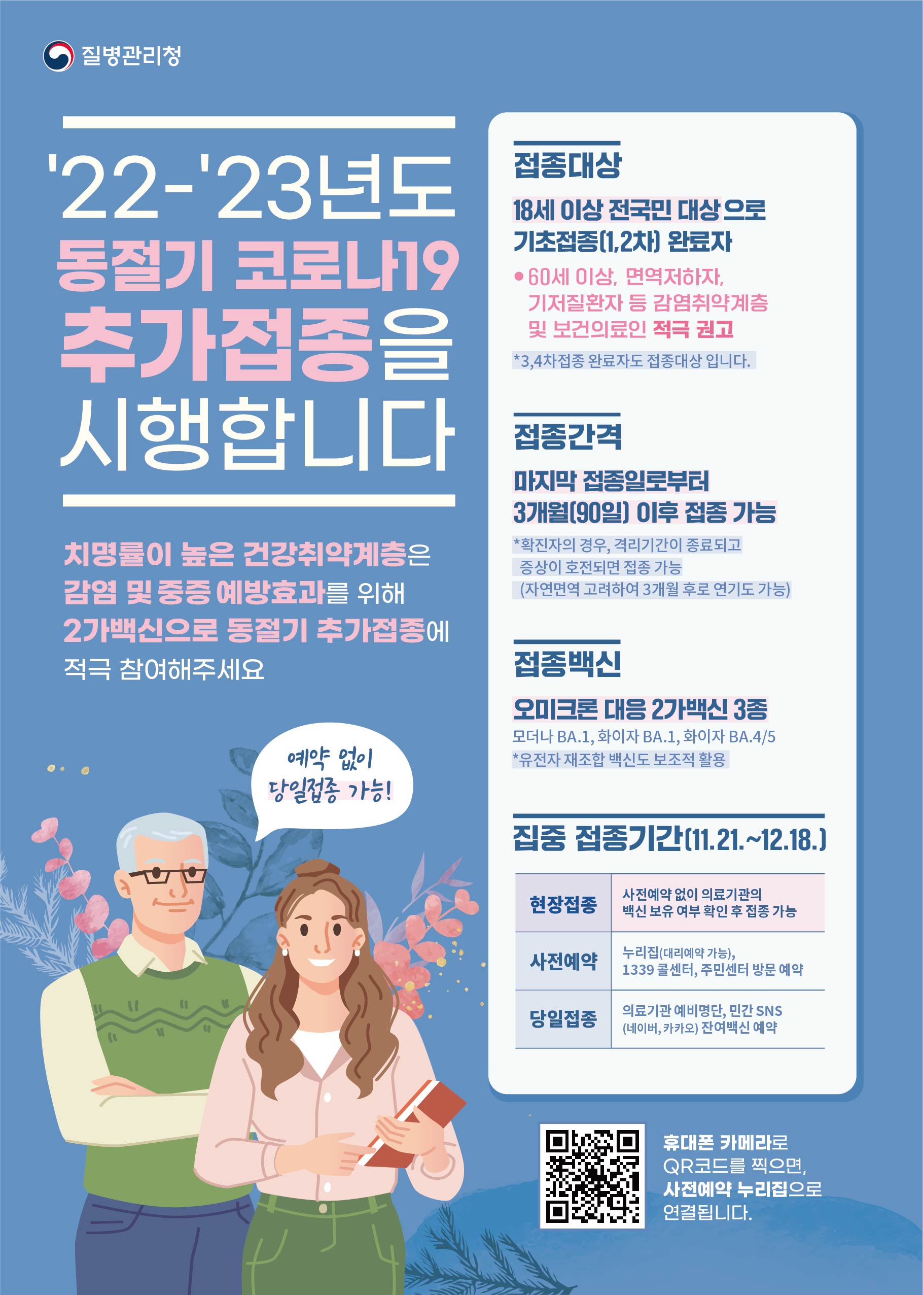 11월 21일 ~ 12월18일 까지 동절기 추가접종 집중 접종기간을 운영하오니 꼭 면역취약자 등은 접종을