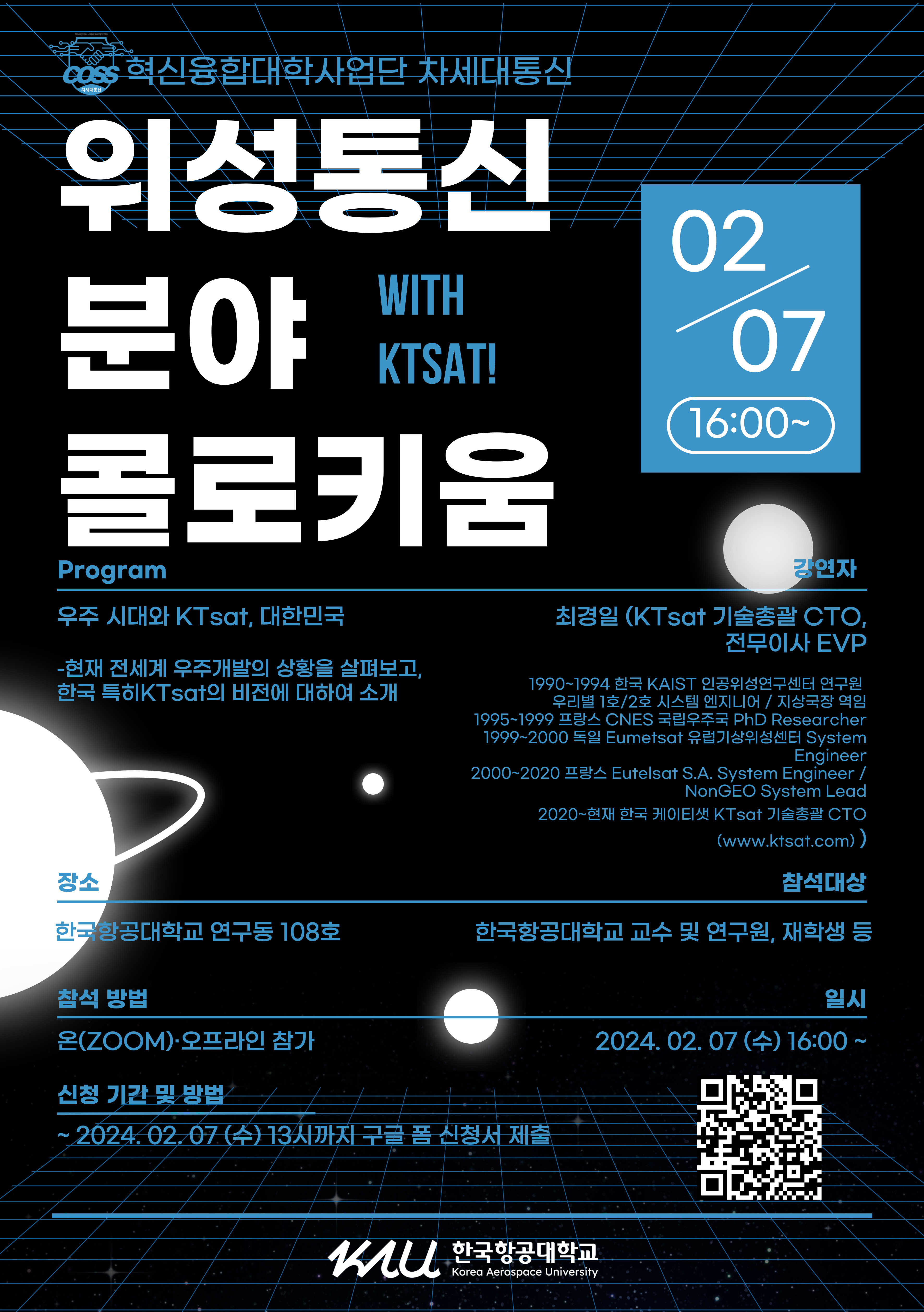 16:10 ~ 17:00 | 50’ | (강의) 우주 시대와 KTsat, 대한민국 | 최경일(KTsat 기술총괄 CTO) |