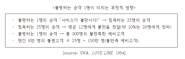 경쟁이 치열할수록 기업은 만족보다 불만에 더 민감해집니다. LCC의 성공 신화를 쌓은 사우스웨스트항공(SWA)은 일찍이 불만족한 고객의 영향력을 이렇게 분석했습니다. “불평하는 1명의 승객이 있다면, 거기엔 침묵하는 25명의 승객이 있다. 침묵하는 승객마다 평균 12명에게 불만을 전달하고, 침묵하는 승객 중 10%는 20명 이상에게 전달한다.” 1명의 불평 고객은 곧 300명의 불만족한 예비고객들이 있다는 뜻입니다. 당시 이 항공사에 전달된 불평 건수가 연간 6만 건 보고되었는데, 이는 적어도 150만 명의 불만 고객이 존재함을 뜻했습니다. 그 후 브리티시항공도 승객 불만을 조사한 결과, 8%만이 고객센터에 불만 사항을 전달하고 있었습니다. 이렇듯 불만족한 고객들은 쉽게 불평을 표출하지 않습니다. 그냥 침묵하는 편이 낫습니다. 불평은 비용이 드는 일이기 때문입니다.