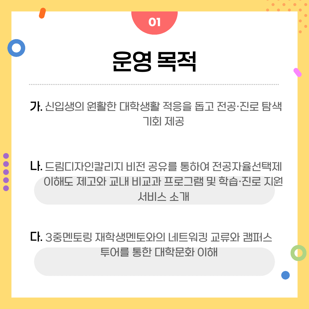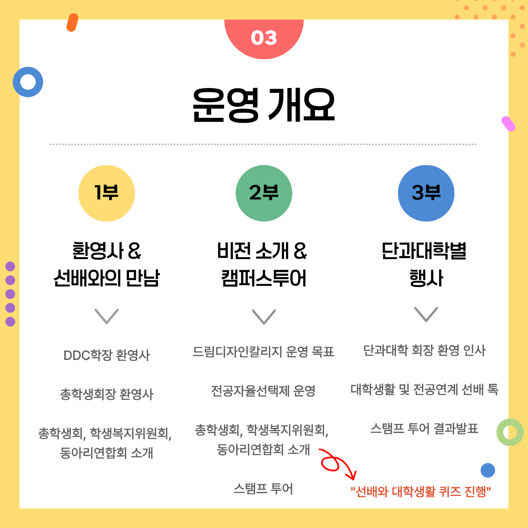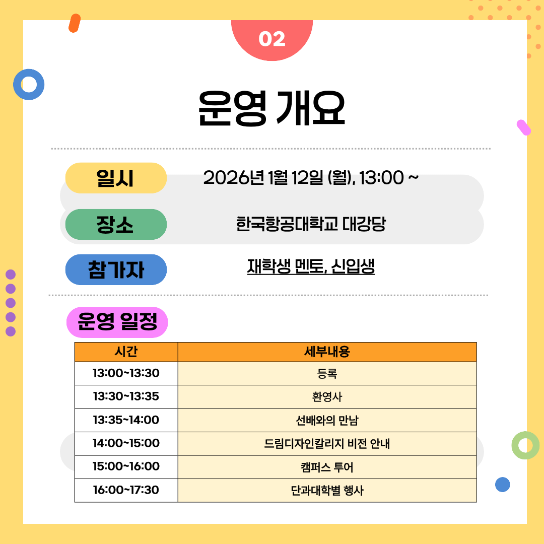 드림디자인칼리지의 비전을 함께 나누며 전공자율선택제에 대한 이해를 높이고, 다양한 교내 비교과 프로그램과 학습·진로 지원 서비스를 자연스럽게 경험할 수 있습니다.