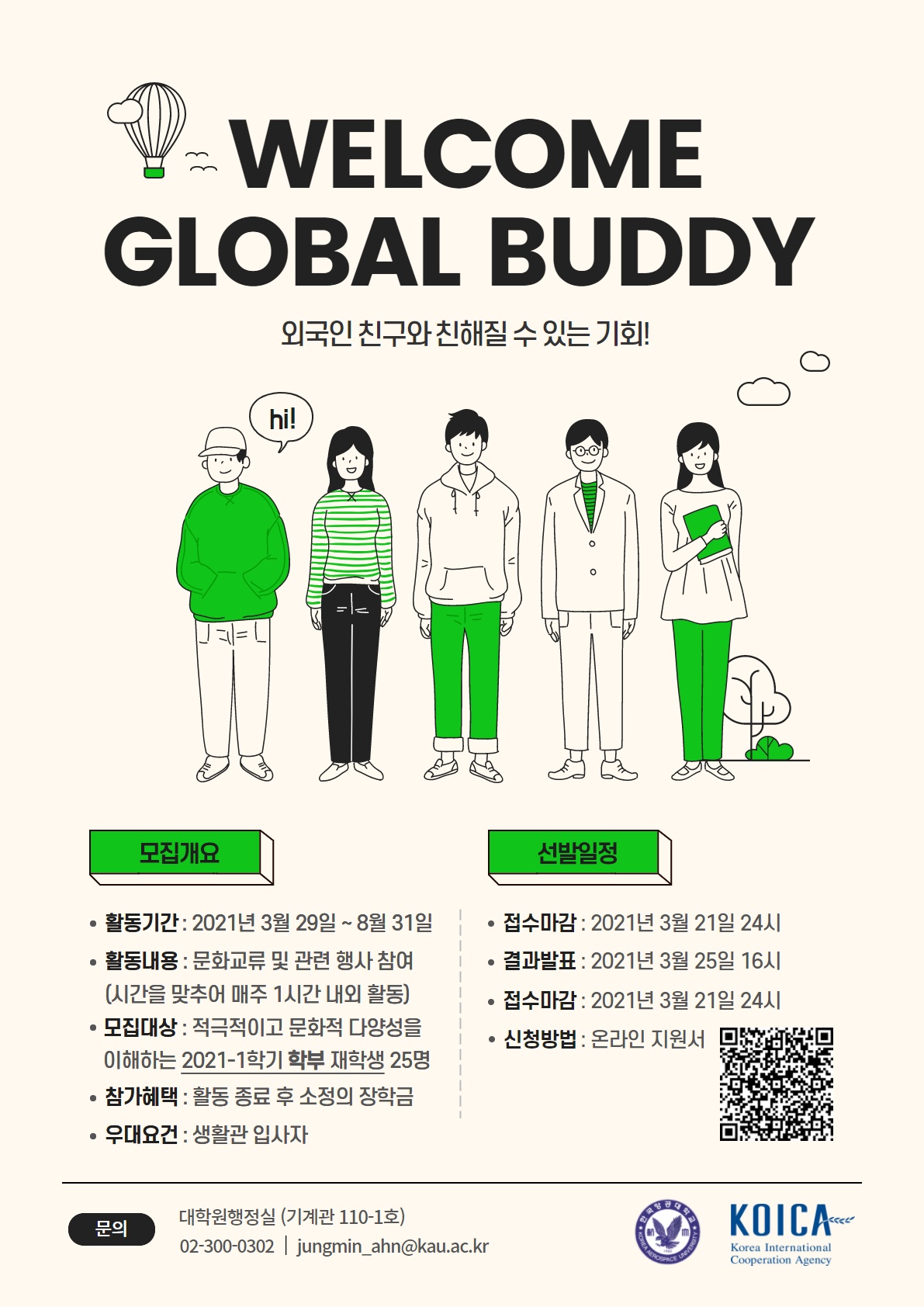 한국항공대학교 일반대학원은 KOICA 항공분야 석사학위 연수생들의 입국에 따른 글로벌 버디 프로그램을 실시하고자 합니다. 외국인 학생들이 본교 생활에 잘 적응할 수 있도록 도움을 줄 수 있는 글로벌 버디 프로그램 참가자를 다음과 같이 선발하고자 하오니 관심 있는 학생들의 많은 참가 바랍니다.