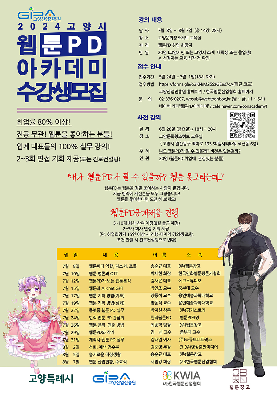 고양시 고양산업진흥원에서 고양시민 또는 고양시 소재 대학생을 대상으로 웹툰 PD 취업 희망자를 대상으로 2024 고양시 웹툰 PD 아카데미 수강생을 아래와 같이 모집하오니 관심있는 학생들의 많은 참여 바랍니다.