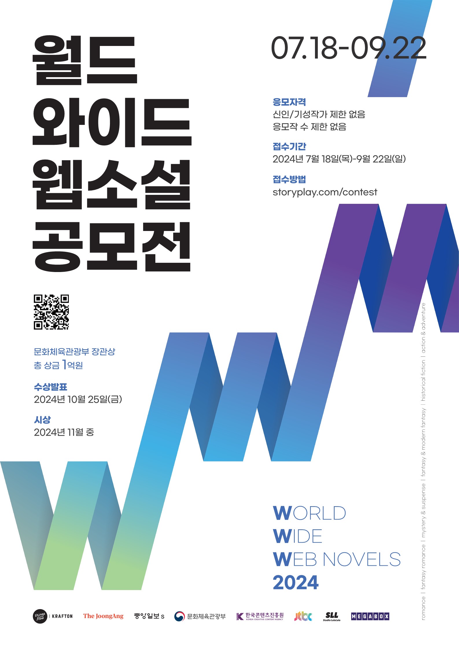 후원하는 “2024 WWW 월드 와이드 웹소설 공모전”을 다음과 같이 안내하오니 많은 학생들의 참여 바랍니다.